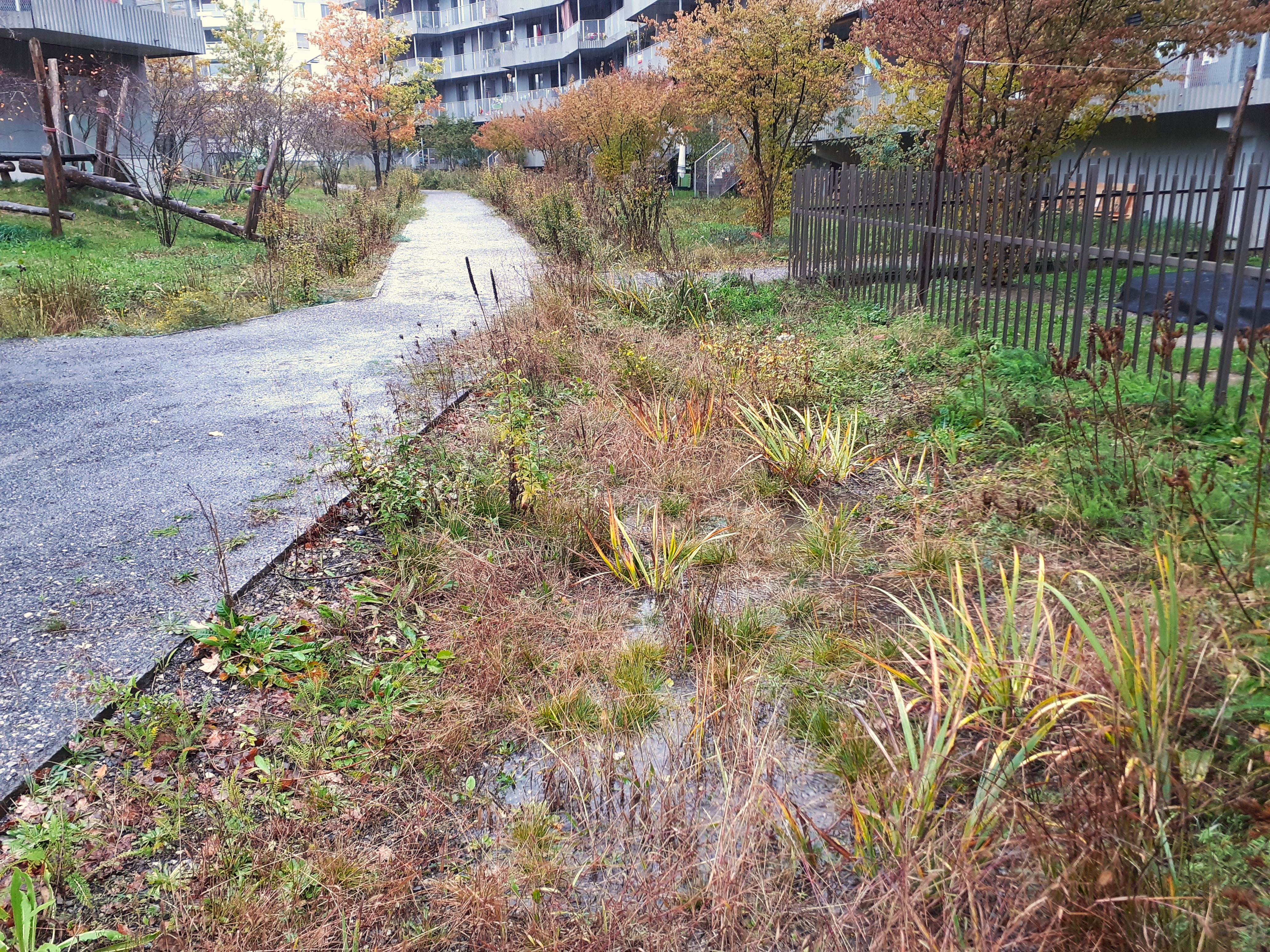 Die Überbauung Stöckacker Süd ist ein Pionierprojekt. An die, dem Fonds für Boden- und Wohnbaupolitik der Stadt Bern gehörende Siedlung, wurden bereits auf Stufe Projektwettbewerb hohe Anforderungen gestellt. Die Stadt forderte qualitativ hochwertige Aussenräume mit einer diversifizierten einheimischen Bepflanzung sowie einen Schilfteich für die Reinigung des Regenwassers sowie den Standard Minergie-P-ECO für die Häuser. Die nun gebaute Siedlung geht im Umgang mit dem Wasser sogar über die Anforderungen des Wettbewerbs hinaus. Neben üppigen Grünflächen, wasserdurchlässigen Belägen und begrünten Dächern wurde ein Konzept für die integrierte Wasser- und Biomassenutzung (IWB) in einem der Häuser umgesetzt. Dies ermöglicht täglich rund 15’000 Liter Trinkwasser einzusparen. Das Abwasser aus Toiletten, Waschmaschinen und Küchen wird aufbereitet und wiederverwendet. Die Siedlung Stöckacker Süd vereint viele Elemente, die dem Prinzip der Schwammstadt entsprechen und ist auch ein gelungenes Beispiel für die bauliche Verdichtung.